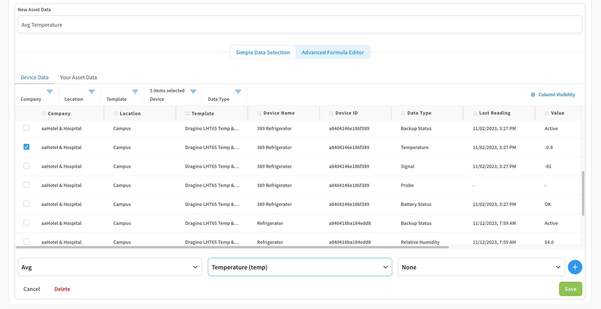 Selecting Multiple Data Sets: With Advanced Formula Editor, you can create 1 or more data sets for an asset that can be used to calculate your assets data.