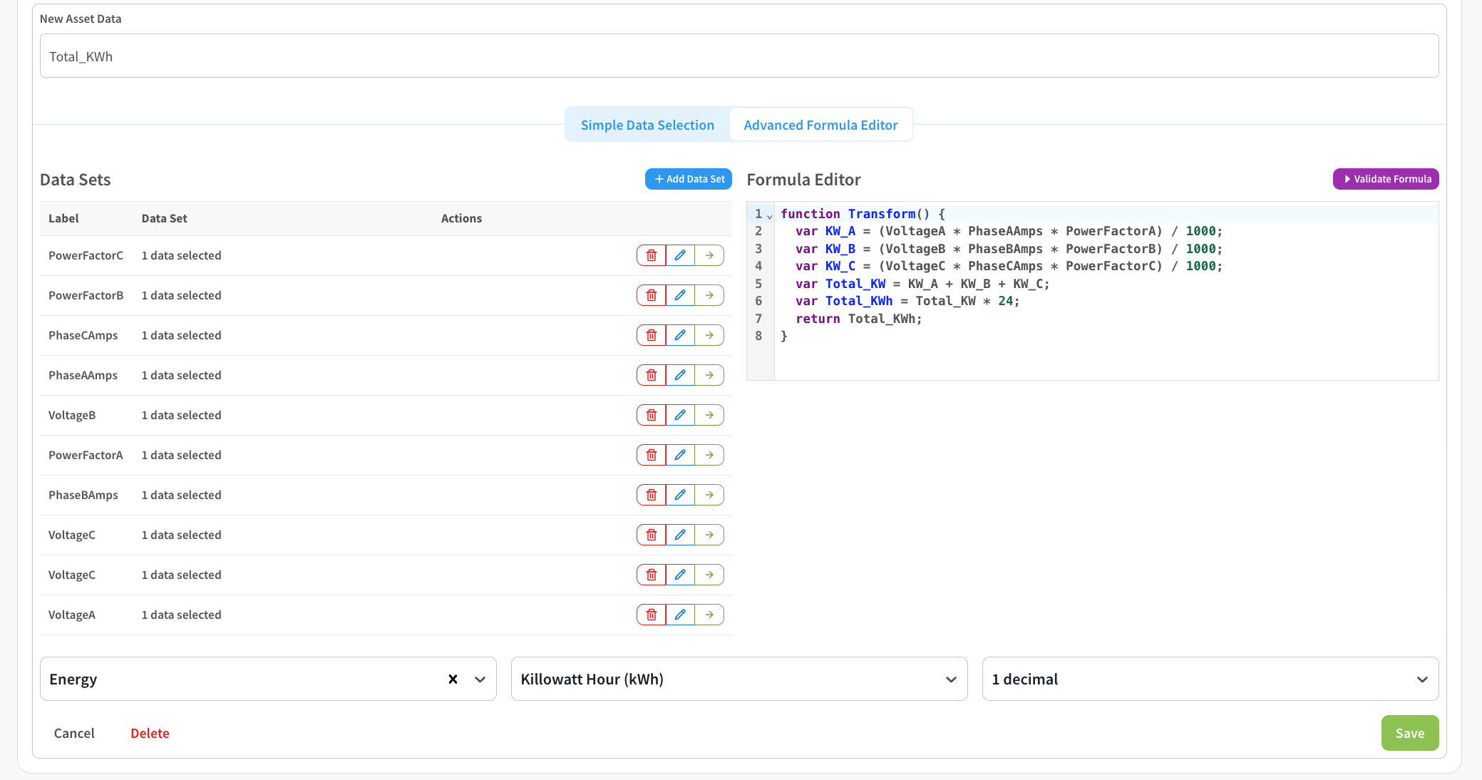 Creating Formulas using native javascript code: Our asset services uses standard JS code to process formulas and calculated data points. Some JS examples of its versatility include consolidating data from multiple Vutility Hotdrop devices monitoring a three-phase compressor or aggregating data from all the doors in a building by summing up "Total People In" and "Total Pe