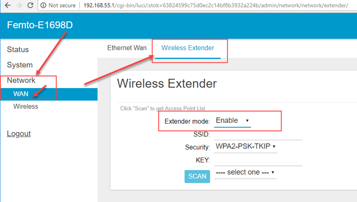 On the left hand side, click on Network > WAN > Wireless Extender.
