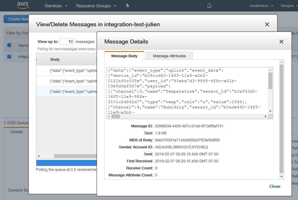 You can verify the integration is working by logging into the Amazon Console and viewing the Queue Messages.