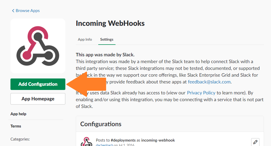 Go to the Slack Incoming Webhooks app page and click on Add Configuration.