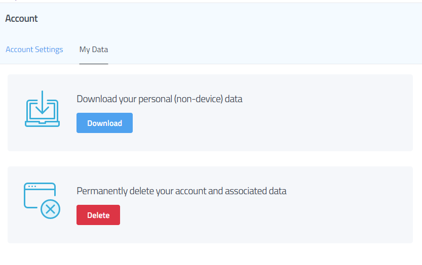 You can use the My Data screen to download or remove your personal data. You can access this screen by selecting Account in the top nav bar and then the My Data tab.
