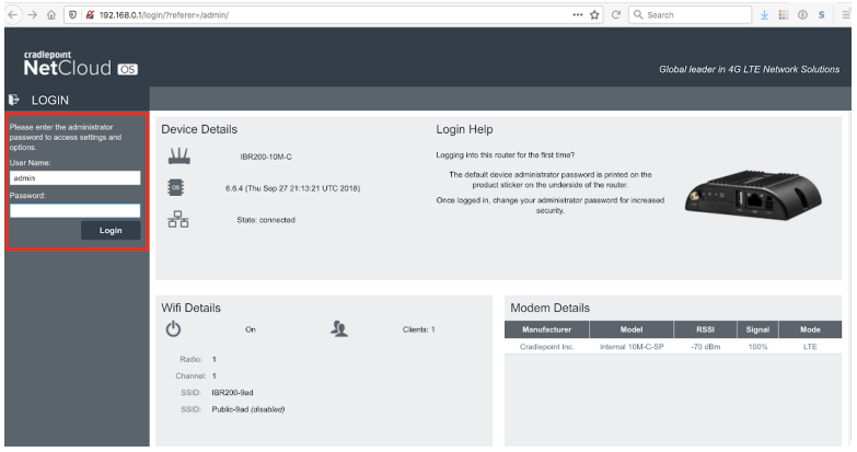Login in the highlighted area with username admin and use the Default Password from the label on the bottom of the Cradlepoint device.
