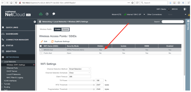 The following instructions will help you to hide the default broadcast WiFi AP created by the Cradlepoint router during operation.