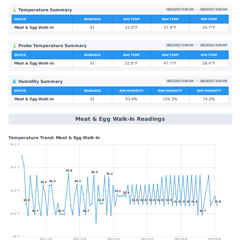Summary Section – For each sensor data point, shows the number of readings, and min/max/average reading in the report period.