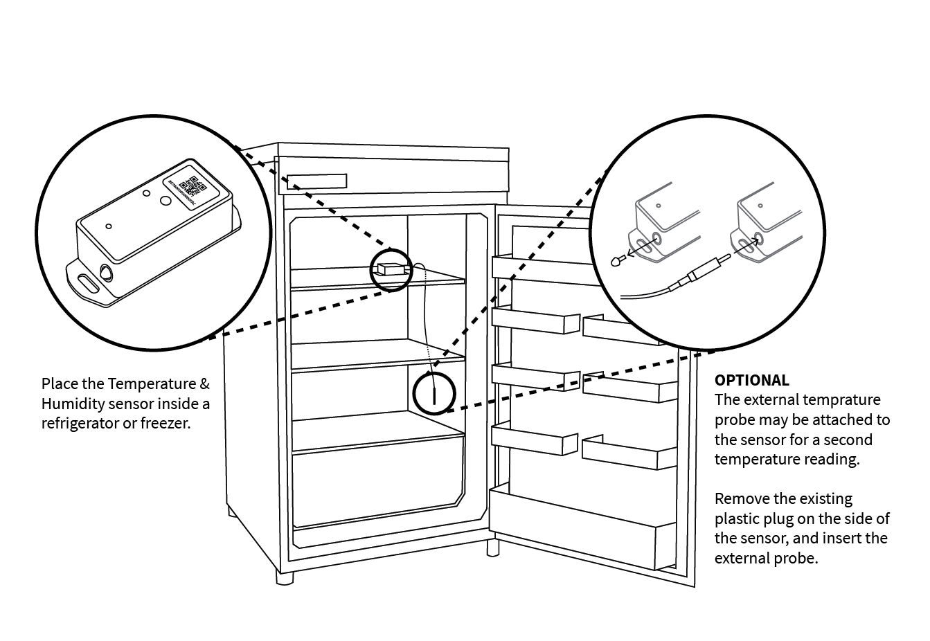 (External Probe – OPTIONAL) Connect the external probe to the sensor by removing the plastic plug and inserting the probe.