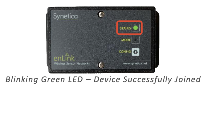 When the device has successfully joined the network the Status LED will blink GREEN five times to show that the join has been completed. The LED’s will then switch off to conserve the batteries.