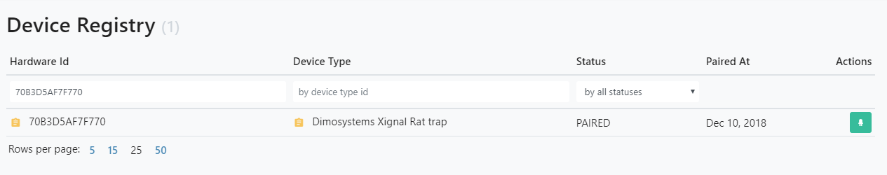đź’ˇ Tip: The easiest way to locate the correct device is to have the Hardware ID (the string of numbers shown next to the QR Code on the device itself). However, you can manually search through the list, using the other fields (such as filter by Status) to narrow the results.