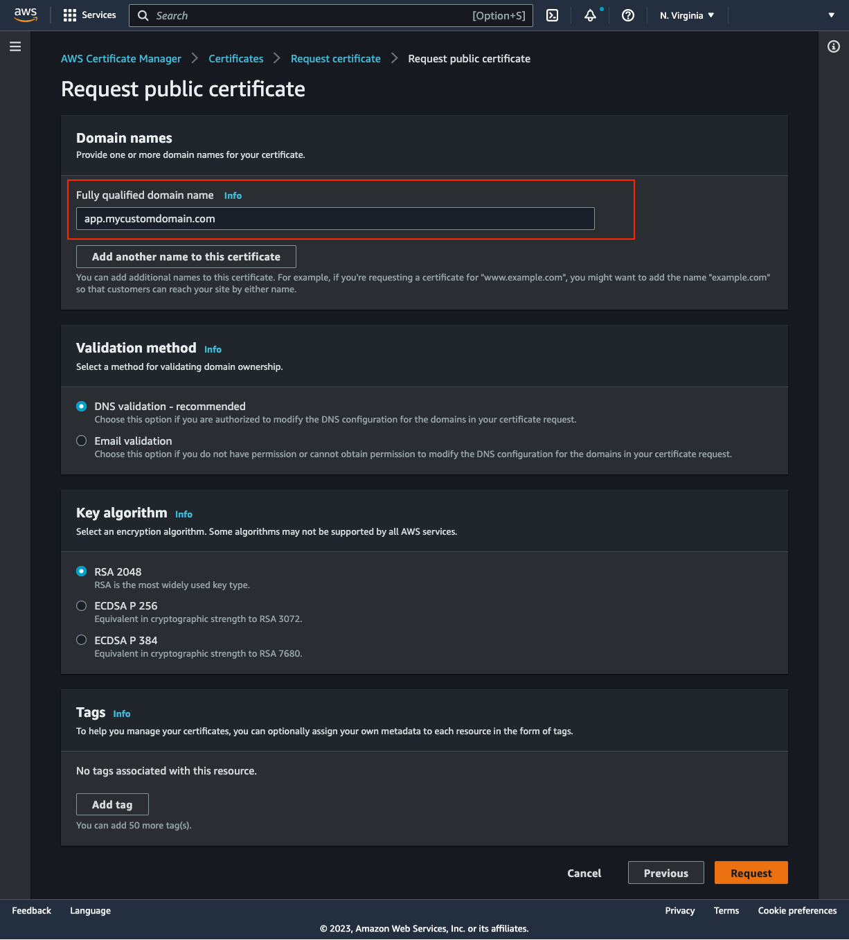 If you want to follow the optional step of creating a free cert in AWS ACM, the following information will help guide you through this.