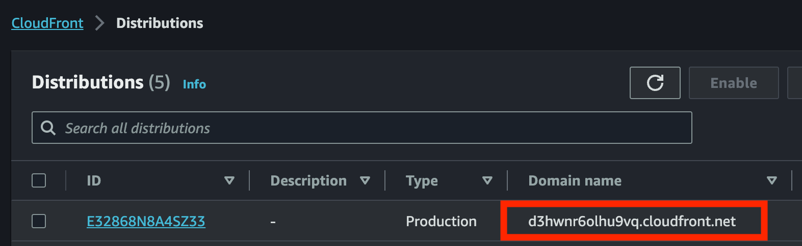 Each CloudFront distribution has a unique domain name generated by AWS when the distribution is created. Create a CNAME record in your DNS provider, that points your custom domain at the unique hostname for your CloudFront distribution.