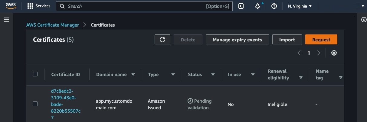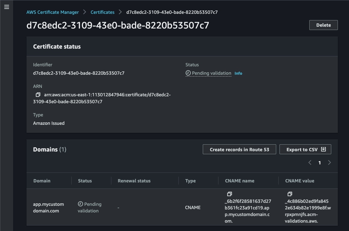 Once DNS records are ready, wait for ACM to change status for the SSL cert to Issued.