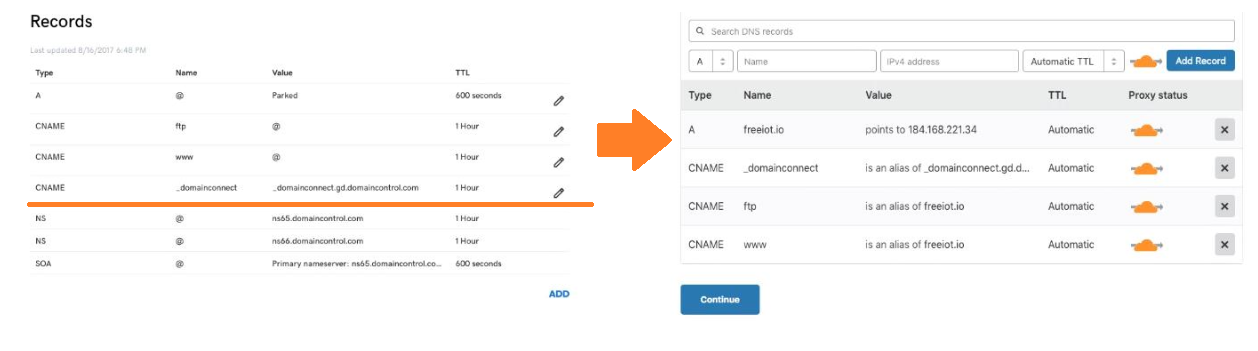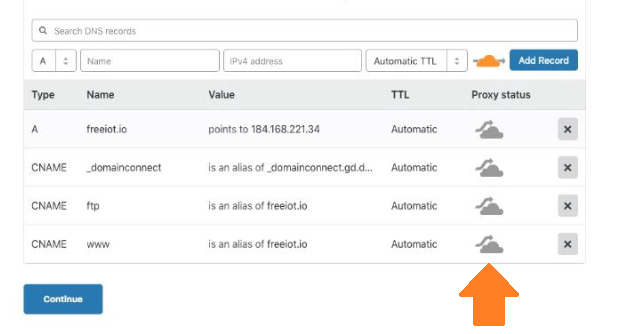 Important: To prevent any interruption for users who might be using your current domain, we recommend disabling Proxy status (change it from highlighted to not) before continuing. This step tells Cloudflare to just do DNS resolving, bypassing Cloudflare’s additional acceleration and protection services (i.e. Cloudflare will provide a similar service to what GoDaddy was providing for DNS).